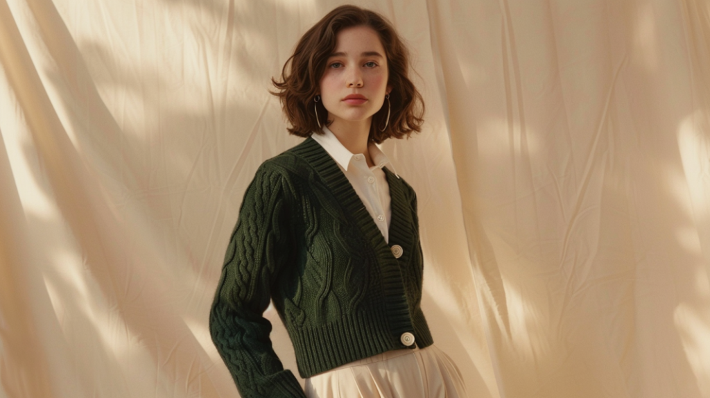 This look pairs a cozy cropped cable knit cardigan in a warm taupe shade with a flowy pleated skirt and a delicate white blouse. The intricate knit pattern adds texture and visual interest, while the soft, neutral tones create an effortlessly feminine vibe. The combination of structure and movement makes this outfit feel both relaxed and elegant.