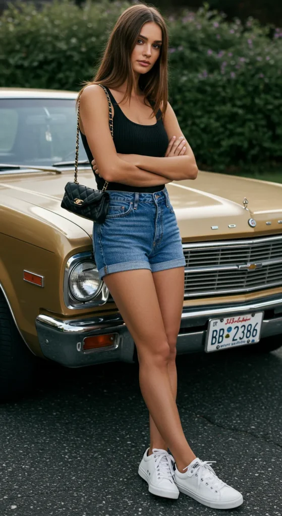 This look is all about classic simplicity and effortless chic. The outfit features a fitted black ribbed tank top paired with high-waisted denim shorts, creating the perfect balance between comfort and style. The shorts are slightly rolled at the hems, giving a relaxed, laid-back vibe. Paired with sleek white sneakers and a mini Chanel bag, this outfit exudes cool, casual sophistication.