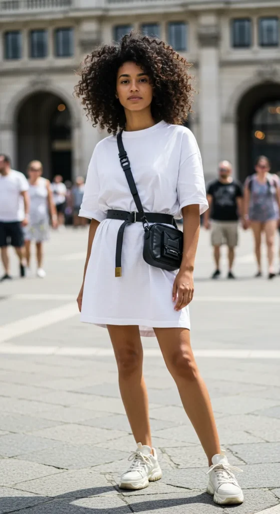 This look features a simple yet stylish white oversized t-shirt dress that exudes laid-back chic. The dress is paired with a black belt that cinches the waist, adding structure and a touch of edgy flair. Completing the outfit are white sneakers and a small black crossbody bag, making it perfect for a day of running errands or hanging out with friends in the city.