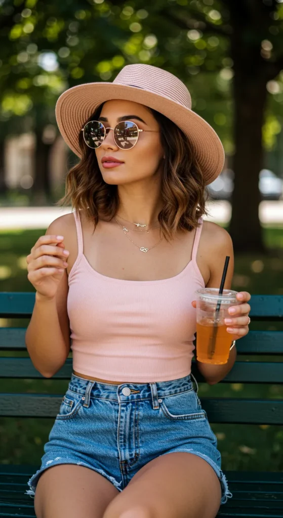 This outfit combines the perfect elements for a sunny day. The light pink ribbed tank top is simple yet chic, and paired with high-waisted, distressed denim shorts, it strikes the right balance between casual and fashionable. A wide-brimmed hat and round sunglasses complete the look, giving off major cool-girl vibes. The iced drink in hand makes it clear this look is all about enjoying the good weather in style.