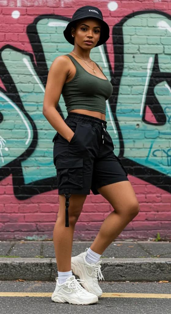 What I love most about this outfit is how effortlessly cool it feels. The mix of the cropped tank and cargo shorts is perfect for warm days, while the accessories like the bucket hat add a fun, street-inspired twist. The white sneakers bring the whole outfit together, making it comfy and on-trend. This is definitely a look that works for any casual outing, and it makes staying chic in the heat easy!