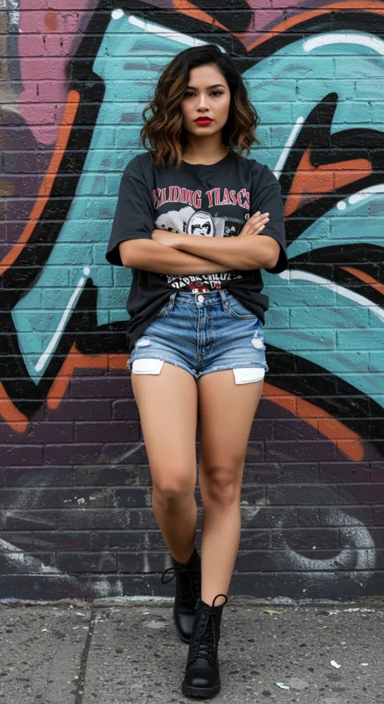 This outfit brings the perfect mix of edgy and casual vibes. The oversized graphic tee, paired with ripped denim shorts, offers a relaxed, cool-girl look that’s super easy to pull off. The black combat boots add a bit of attitude, while the bold red lip gives the whole outfit a pop of glam. Set against the vibrant street art backdrop, this look screams street-style queen, effortlessly blending comfort and style for a laid-back but eye-catching outfit.