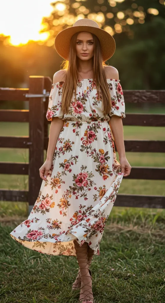This outfit is all about that sweet and effortless summer charm. A gorgeous off-the-shoulder floral dress in soft white with vibrant flowers in red, pink, and yellow hues offers a romantic, boho vibe. The cinched waist and flowy skirt add movement and grace, while the tan gladiator sandals and straw hat give the look a laid-back, earthy touch. The warm sunset glow behind her just completes this dreamy look, perfect for a stroll in the park or a cute picnic by the lake.