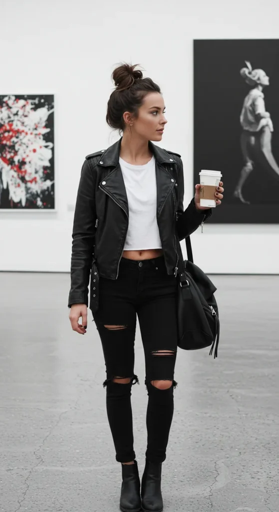 This outfit has that effortlessly cool vibe that’s perfect for when you want to look fierce but still chill. A cropped white t-shirt pairs seamlessly with black ripped skinny jeans, giving off a laid-back yet chic feel. The black leather jacket adds a bold, edgy touch, and the ankle boots keep the look grounded and stylish. To top it all off, a sleek black bag and a coffee in hand just add that “I’m ready to take on the world” vibe. It’s the ideal look for a day out in the city or just hanging with friends.