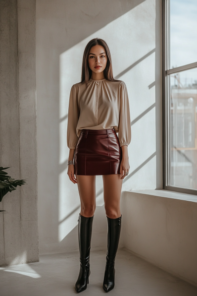 This look blends soft elegance with bold edge. The beige blouse, with its flowing puffed sleeves and high neckline, brings a touch of refinement, while the burgundy leather mini skirt adds a striking, modern twist. The fitted, high-waisted skirt contrasts beautifully against the loose fit of the top, making the outfit both polished and playful. Black knee-high leather boots complete the ensemble, pulling it all together with a sleek, confident vibe. It’s a perfect look for the woman who wants to look effortlessly chic and on-trend.