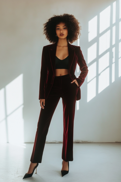 This burgundy velvet suit is all about making a bold fashion statement with a luxurious feel. The rich texture of the velvet instantly elevates the classic tailored suit, while the cropped black top underneath adds a contemporary edge. Paired with sleek black heels, this outfit is both daring and elegant, perfect for a night out or a fashionable event. The structured blazer and high-waisted trousers elongate the figure, giving it a confident, powerful vibe.