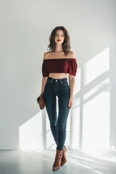 This outfit is perfect for those laid-back days when you still want to look effortlessly cute. The burgundy off-shoulder crop top adds a flirty, feminine touch with its puffed sleeves and cropped length. Paired with dark high-waisted skinny jeans, the look is both casual and stylish. The ankle boots and simple clutch give it a polished finish, making it a great option for a day out with friends or a casual dinner date.
