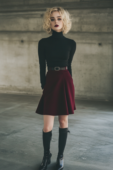 This outfit brings a classic, vintage vibe with a modern twist. The sleek black turtleneck is perfectly fitted, providing a polished base for the look, while the burgundy skater skirt adds movement and a pop of rich color. Cinched at the waist with a bold belt, the outfit creates a flattering silhouette that’s both feminine and sharp. Paired with knee-high boots, this look is equal parts edgy and elegant, ideal for anything from a coffee date to a casual afternoon stroll.