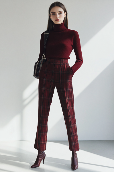 This outfit is the perfect blend of preppy and polished. The rich burgundy turtleneck keeps things sleek and sophisticated, while the high-waisted plaid trousers add a fun, classic pattern that’s totally timeless. With matching burgundy ankle boots and a structured bag, the outfit is both coordinated and effortlessly stylish. The high-waisted fit and tailored trousers create a long, lean silhouette, making this a go-to look for work or a stylish day out.