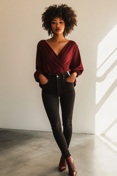 Effortless Elegance: Burgundy Wrap Top with High-Waisted Black Jeans