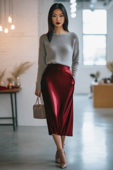 This outfit is the perfect balance between cozy and glamorous. The soft, slightly oversized grey sweater adds a relaxed, casual touch, while the sleek burgundy satin midi skirt brings in a sophisticated, luxurious vibe. The contrast between the textures of knit and satin makes the look visually interesting and effortlessly stylish. Paired with nude heels and a chic handbag, this ensemble is perfect for brunch, a casual dinner, or even an office holiday party.