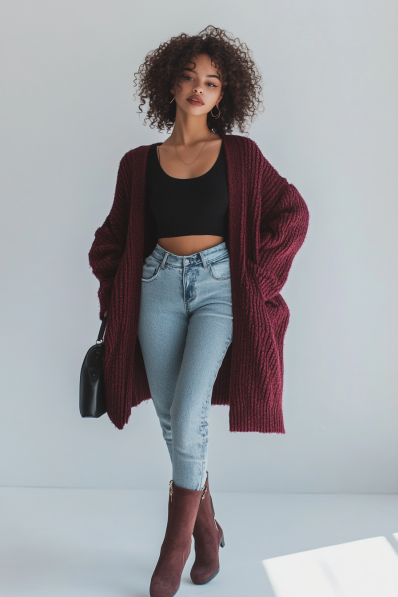 This look is all about cozy vibes with a chic twist. The oversized burgundy knit cardigan wraps you up in comfort while still looking effortlessly cool. Paired with light-wash high-waisted jeans and a simple black crop top, the outfit strikes a perfect balance between laid-back and stylish. The chunky burgundy boots pull the whole look together, adding just the right amount of edge to the otherwise relaxed feel. This is the kind of outfit that’s perfect for running errands or grabbing coffee with friends but still looks totally Instagram-ready.