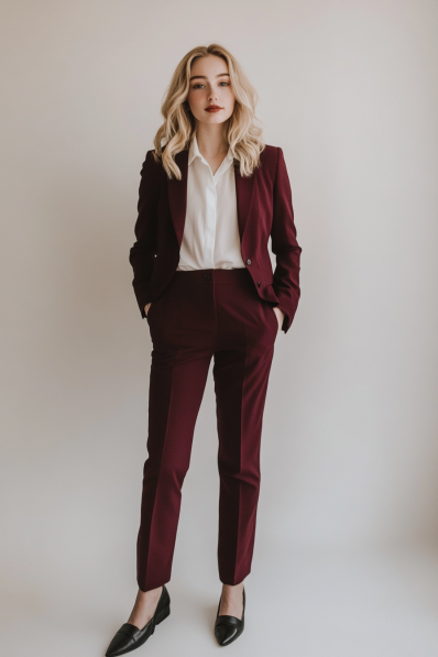 Honestly, who doesn’t love a good power suit? I’m obsessed with how this burgundy shade adds a bit of personality while still keeping things totally professional. It’s bold but not too loud—the perfect middle ground. And paired with the classic white shirt? It’s like a masterclass in effortless boss-lady style! I could totally see myself rocking this in any high-stakes situation, knowing I look sharp and feel unstoppable.