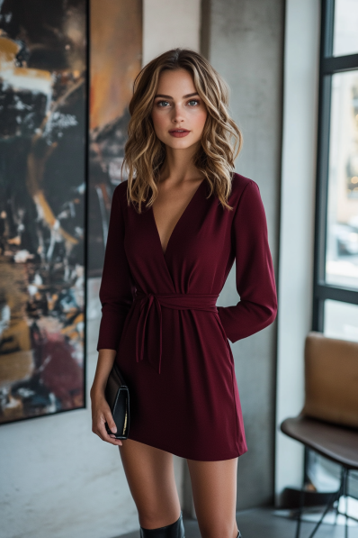 This stunning burgundy wrap dress is all about confidence and power. With its deep V-neckline and waist-cinching tie, it hugs the body in all the right places, creating a sleek and flattering silhouette. The knee-high black boots add an extra layer of boldness, making this look perfect for a night out or any occasion where you want to make a statement. The deep burgundy color and fitted style exude elegance while still keeping it sexy and modern.
