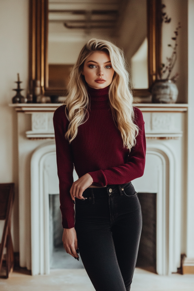 Classic & Cozy: Burgundy Turtleneck Paired with Black High-Waisted Jeans