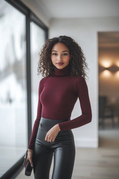 This outfit is the perfect blend of sleek and sophisticated. The form-fitting burgundy turtleneck adds warmth and elegance, while the high-waisted black faux leather pants give the look a modern, edgy twist. The clean lines and simple accessories make it an effortlessly chic outfit that’s ready for anything from a night out to a casual dinner. It’s a minimalist approach that still packs a fashion-forward punch.