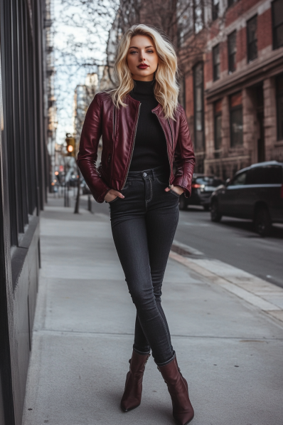 This outfit screams confidence and city chic! The burgundy leather jacket adds a bold, edgy twist to the classic black turtleneck and high-waisted black skinny jeans. The structured leather elevates the look, giving it that biker vibe without being too over-the-top. Burgundy ankle boots tie everything together perfectly, creating a sleek silhouette that’s ideal for strutting through the city. Whether you’re heading out for a casual lunch or just want to feel like a total boss, this look has you covered.