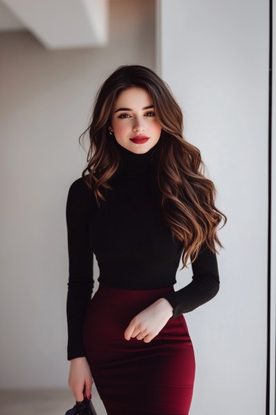 This outfit is pure sophistication with a touch of boldness. The fitted black turtleneck creates a sleek and classic top half, while the deep burgundy pencil skirt adds a pop of color and flatters the figure beautifully. The combination of the black and burgundy is both understated and eye-catching, making this an ideal choice for anything from a workday at the office to a fancy dinner. The overall look is polished, professional, and effortlessly chic.