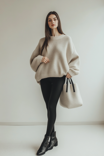 This casual date night outfit is all about staying cozy while looking effortlessly chic. It features an oversized beige knit sweater with a relaxed, comfy vibe, paired with sleek black leggings that add the perfect contrast. Black ankle boots finish off the look, keeping it minimal yet stylish. To top it all off, the large beige tote bag brings practicality and matches the sweater, keeping the outfit simple and balanced.