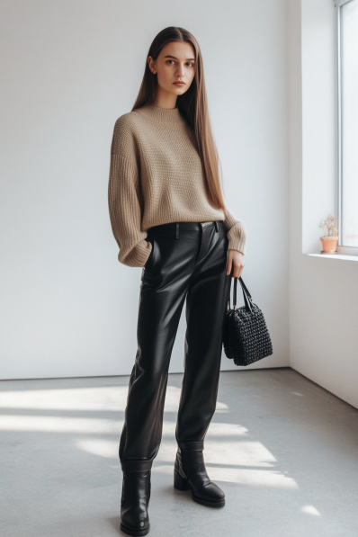 What I love about this look is how effortlessly cool it feels. The leather pants add just the right amount of edge to the outfit, while the oversized knit sweater keeps things soft and approachable. It’s the kind of outfit that makes you look instantly stylish without feeling overdone. Perfect for a cozy dinner or even a casual gallery stroll—it’s both comfy and chic!