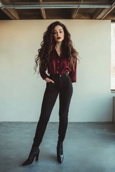 This bold yet classy date night outfit features a deep burgundy satin blouse tucked into high-waisted black skinny jeans. The satin texture of the blouse adds a luxe feel, while the fitted jeans balance the look with a sleek, modern silhouette. Paired with black ankle boots, this outfit is polished, confident, and perfect for a night out when you want to turn heads.