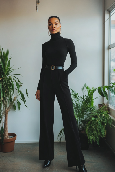 Sleek Black Turtleneck with Wide-Leg Trousers