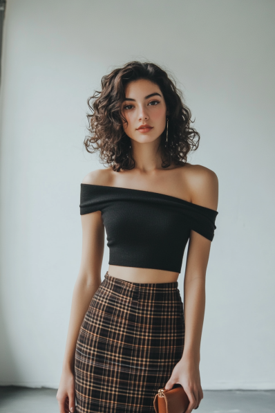 This casual date night outfit mixes feminine charm with a touch of preppy style. The black off-shoulder crop top brings a flirty and sleek vibe, while the high-waisted plaid skirt adds a fun pattern that contrasts beautifully with the solid top. Paired with minimal accessories, this look is perfect for a daytime date or a cozy evening out.