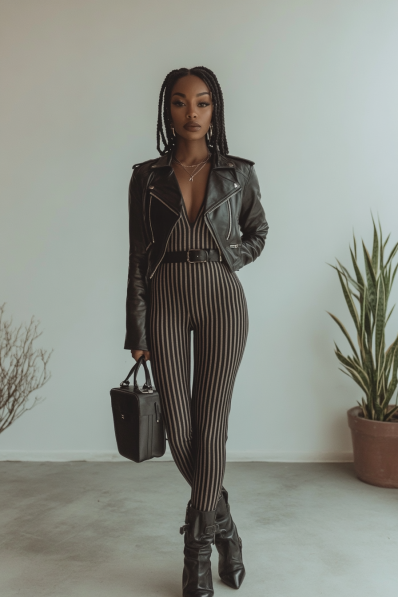 This bold, fashion-forward outfit features a figure-hugging striped jumpsuit paired with a classic black leather jacket. The belt at the waist accentuates the silhouette, while the black ankle boots add a touch of edge. The structured handbag completes the look, making it both stylish and practical for a casual date night.