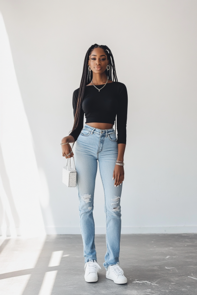 This casual yet edgy date night outfit pairs a sleek black crop top with high-waisted, light-wash ripped jeans. The long sleeves on the crop top balance out the midriff-baring cut, making it perfect for a relaxed yet stylish look. The light-wash jeans add a laid-back vibe with just the right amount of distressing. White sneakers keep it comfortable and casual, while the small white handbag adds a pop of chic contrast.
