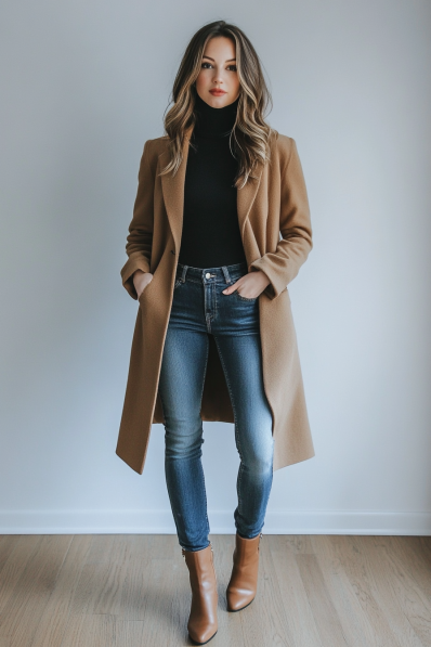 Camel Coat with Black Turtleneck and Skinny Jeans