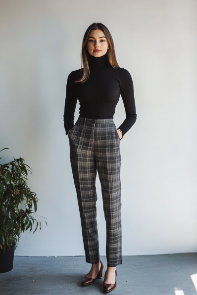 This stylish and sophisticated look features a fitted black turtleneck paired with tailored plaid trousers. The high-waisted trousers create a flattering silhouette, while the subtle plaid pattern adds a touch of classic charm. Finished with sleek brown flats, this outfit is perfect for a casual yet polished date night.