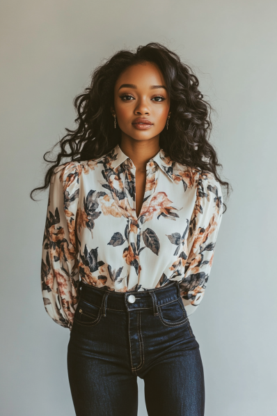 This elegant yet casual look features a beautifully patterned floral blouse with puffed sleeves tucked into high-waisted dark denim jeans. The blouse’s soft, flowy fabric creates a romantic vibe, while the fitted high-waisted jeans add structure and contrast. The floral print offers a nice touch of femininity, making it perfect for a casual date night that feels a little more dressed up without being too formal.