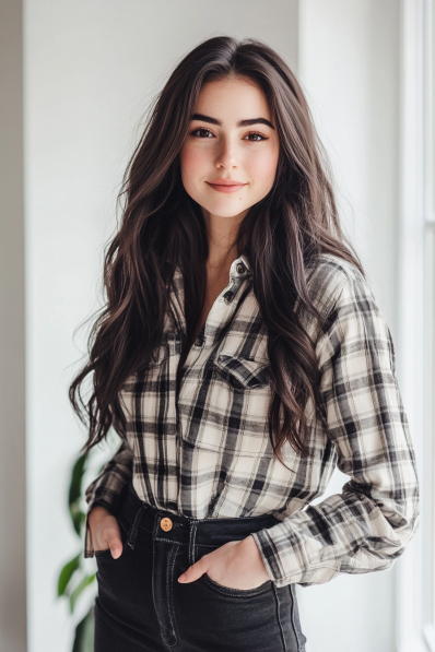 This casual date night look features a timeless black and white plaid shirt tucked into high-waisted black jeans. The soft, relaxed fit of the shirt makes it comfy yet stylish, while the high-waisted jeans give the outfit a structured, flattering silhouette. With hands tucked casually in pockets, this look has that effortless “cool girl” vibe, perfect for a relaxed evening out.
