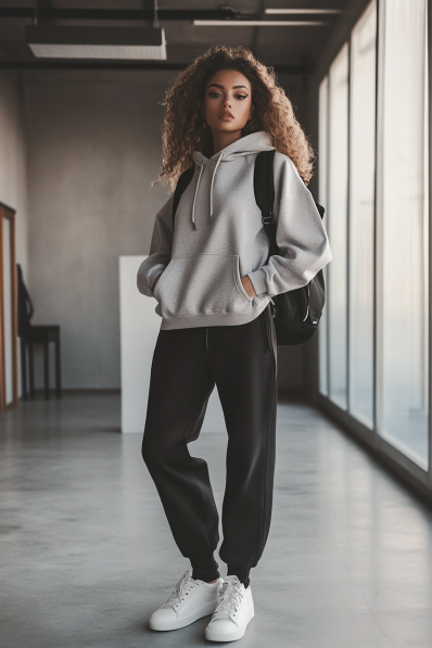 This casual date night outfit is all about comfort without sacrificing style. A cozy gray hoodie pairs perfectly with relaxed black joggers, creating a sporty yet laid-back vibe. White sneakers keep the look fresh, while a black backpack adds a practical touch, making it an ideal choice for a casual hangout or a low-key outdoor date.