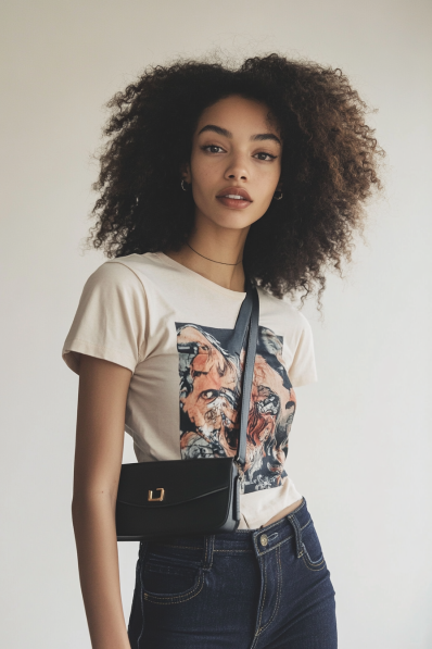 I adore this look because it’s that perfect mix of casual and artsy. The graphic tee shows off some personality, while the dark jeans keep things sleek and flattering. It’s the kind of outfit that feels cool without trying too hard—ideal for a casual coffee date or a fun art gallery outing. The black crossbody bag adds just the right amount of chic without being overdone!