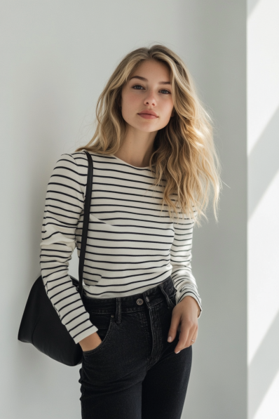 What I love most about this look is how it manages to be both classic and casual at the same time. The striped top is a wardrobe staple that never goes out of style, and paired with the black jeans, it creates a look that’s polished but not too dressy. It’s perfect for a daytime coffee date or a casual dinner—it’s one of those outfits that always looks put together without feeling overdone!