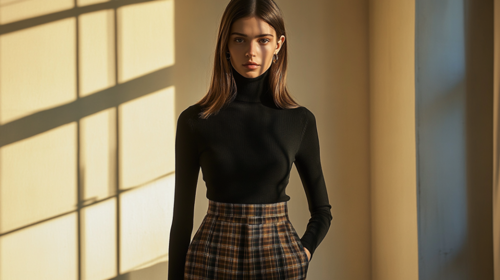 I love how this outfit blends the timeless appeal of a black turtleneck with the playful, preppy vibe of plaid trousers. It’s perfect for a casual dinner or even a daytime museum date. The combination feels effortlessly chic, and the brown flats add just the right amount of contrast to keep things interesting. This look is understated yet undeniably stylish!