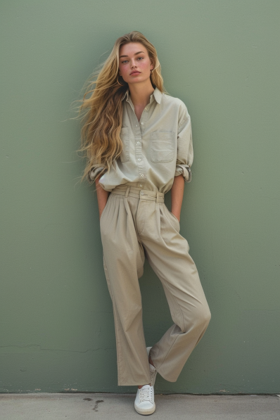 This outfit is the epitome of effortless sophistication. A loose, tucked-in button-up shirt in a soft beige pairs beautifully with wide-leg, high-waisted trousers in a matching neutral tone. The belted waist adds subtle definition, while white sneakers keep the look grounded and casually chic. The minimal, natural styling and flowing hair complete this breezy, timeless ensemble.