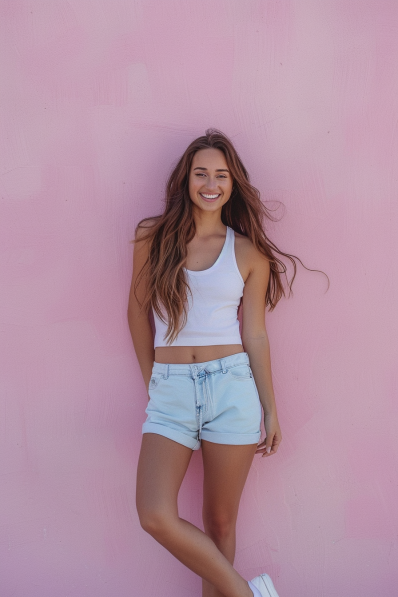 This outfit is a summer date dream! A fitted white tank top pairs perfectly with light-wash denim shorts for a breezy, casual look. The soft pastel tones feel fresh and light, while the classic white sneakers tie it all together with a sporty touch. Loose, natural waves and a radiant smile make this outfit even more effortlessly charming.