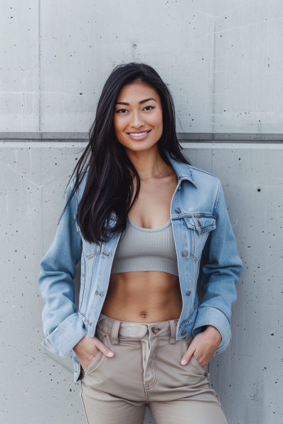 This outfit is a perfect mix of sporty and stylish. A cropped, ribbed tank in a soft neutral tone pairs effortlessly with a light-wash denim jacket for a casual yet chic vibe. The slim-fit beige trousers add a polished touch, keeping the look balanced and versatile. The natural, flowing hair and relaxed smile complete this fresh and approachable ensemble.