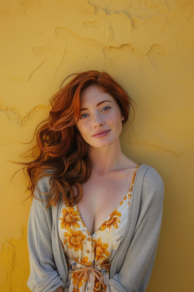This outfit radiates sunshine and charm! A floral dress with warm yellow tones and delicate straps creates a romantic, feminine vibe. The cinched waist adds definition, while a soft gray cardigan draped over the shoulders gives it a cozy, relaxed feel. The loose, tousled waves and natural makeup enhance the fresh, radiant look.