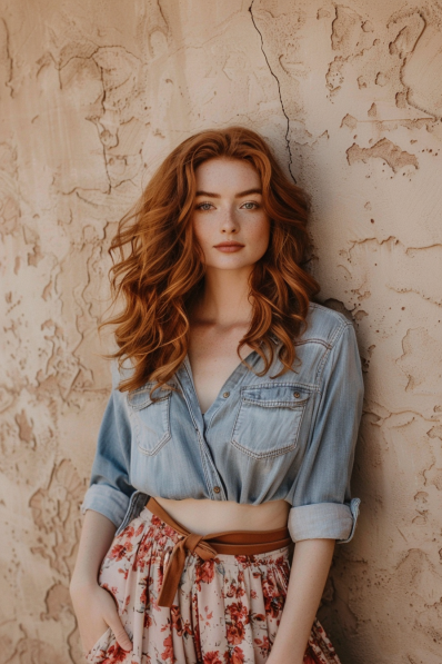 This outfit is a perfect harmony of casual and romantic. A light-wash chambray button-up shirt, tied at the waist, gives off a relaxed, country-chic vibe. Paired with a flowy floral skirt in soft pinks and reds, the combination creates a feminine yet approachable look. The subtle leather belt adds a charming, earthy detail, tying everything together beautifully.