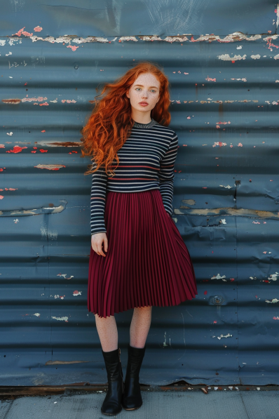 This outfit is the perfect blend of bold and sophisticated. A fitted, striped turtleneck in navy and white pairs effortlessly with a deep burgundy pleated midi skirt, creating a striking contrast of patterns and textures. Chunky black ankle boots add an edgy touch, grounding the look with a bit of attitude. The fiery red hair flowing freely is the ultimate statement accessory!