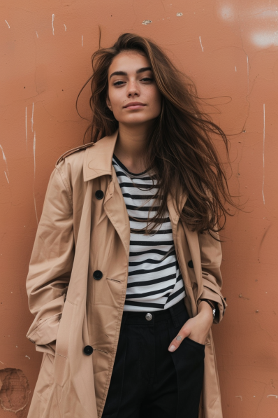 This outfit oozes effortless Parisian chic. A beige trench coat adds timeless sophistication, layered over a classic black-and-white striped top for that effortlessly stylish vibe. Paired with tailored black trousers, it’s a perfect balance of relaxed and refined. The loose, windswept hair gives the entire look a touch of carefree charm.