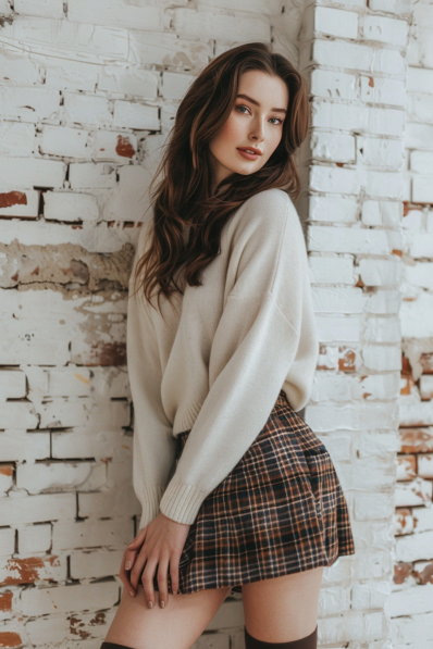 This outfit is the perfect mix of cozy and chic. A soft, oversized cream sweater adds warmth and comfort, while the high-waisted plaid mini skirt brings a playful, preppy vibe. Knee-high socks peeking out add an extra layer of charm and a subtle nod to retro fashion. The effortless curls and natural makeup complete this look with understated elegance.