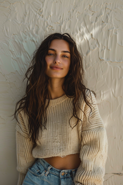 This outfit is a masterclass in effortless charm. A cream-colored, chunky knit sweater with a cropped hem is paired with light-wash, high-waisted jeans for a look that’s equal parts cozy and cool. The soft, textured fabric of the sweater adds warmth, while the slightly distressed edges give it a playful, lived-in vibe. Loose, natural waves complete the look, adding to its relaxed aesthetic.