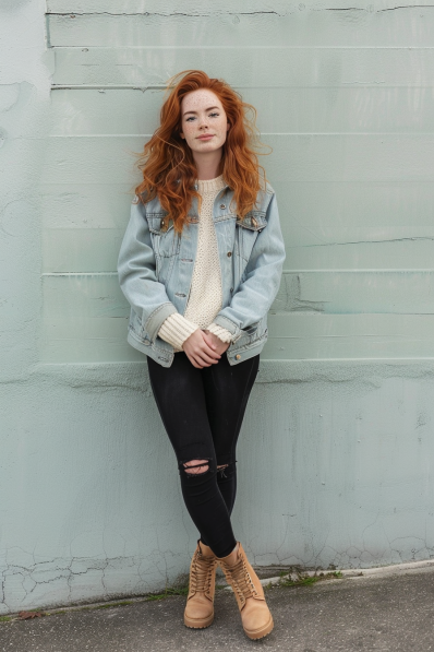 This outfit perfectly combines edgy and cozy. A light-wash denim jacket adds a vintage touch over a chunky cream knit sweater, creating a layered look that’s both warm and stylish. Black ripped skinny jeans give the outfit a hint of attitude, while tan lace-up boots bring a rugged, down-to-earth vibe. The natural flow of her hair and minimal makeup finish the look with an effortless charm.