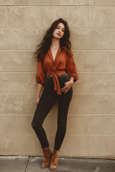 This outfit is a showstopper! A rust-colored tie-front blouse with voluminous sleeves brings a perfect blend of sophistication and flirtiness, while the plunging neckline adds a touch of drama. Paired with high-waisted, dark-wash skinny jeans, it creates a sleek silhouette. To complete the look, tan suede ankle boots add a chic and polished touch, keeping it classy but fun.