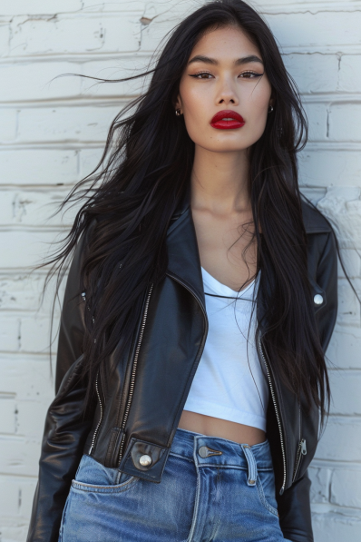 This outfit is a timeless mix of cool and confident. A cropped black leather jacket adds an edgy vibe, perfectly balanced by the simplicity of a crisp white tank top. The relaxed, light-wash jeans keep it casual, while the bold red lipstick elevates the look to iconic status. With sleek, long hair cascading naturally, this outfit screams effortless glam.