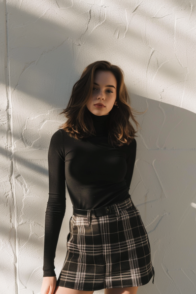 This outfit is a perfect blend of sophistication and flirtiness. A sleek black turtleneck hugs the body for a chic, minimalistic top, while a high-waisted plaid mini skirt adds a playful, preppy vibe. The neutral tones of the skirt pair effortlessly with the bold black top, creating a balanced and polished look. Loose, tousled waves give the outfit a relaxed and approachable finish.